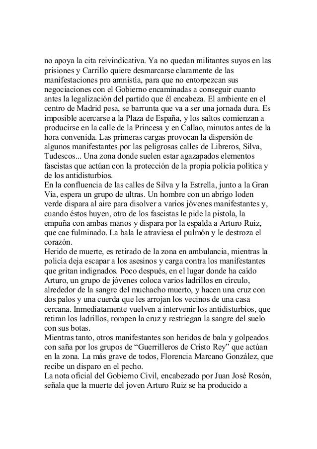 - 10. no apoya la cita reivindicativa. Ya no quedan militantes suyos en las prisiones y Carrillo quiere desmarcarse claramente de las manifestaciones pro amnistía, para que no entorpezcan sus negociaciones con el Gobierno encaminadas a conseguir cuanto antes la legalización del partido que él encabeza. El ambiente en el centro de Madrid pesa, se barrunta que va a ser una jornada dura. Es imposible acercarse a la Plaza de España, y los saltos comienzan a producirse en la calle de la Princesa y en Callao, minutos antes de la hora convenida. Las primeras cargas provocan la dispersión de algunos manifestantes por las peligrosas calles de Libreros, Silva, Tudescos... Una zona donde suelen estar agazapados elementos fascistas que actúan con la protección de la propia policía política y de los antidisturbios. En la confluencia de las calles de Silva y la Estrella, junto a la Gran Vía, espera un grupo de ultras. Un hombre con un abrigo loden verde dispara al aire para disolver a varios jóvenes manifestantes y, cuando éstos huyen, otro de los fascistas le pide la pistola, la empuña con ambas manos y dispara por la espalda a Arturo Ruiz, que cae fulminado. La bala le atraviesa el pulmón y le destroza el corazón. Herido de muerte, es retirado de la zona en ambulancia, mientras la policía deja escapar a los asesinos y carga contra los manifestantes que gritan indignados. Poco después, en el lugar donde ha caído Arturo, un grupo de jóvenes coloca varios ladrillos en círculo, alrededor de la sangre del muchacho muerto, y hacen una cruz con dos palos y una cuerda que les arrojan los vecinos de una casa cercana. Inmediatamente vuelven a intervenir los antidisturbios, que retiran los ladrillos, rompen la cruz y restriegan la sangre del suelo con sus botas. Mientras tanto, otros manifestantes son heridos de bala y golpeados con saña por los grupos de “Guerrilleros de Cristo Rey” que actúan en la zona. La más grave de todos, Florencia Marcano González, que recibe un disparo en el pecho. La nota oficial del Gobierno Civil, encabezado por Juan José Rosón, señala que la muerte del joven Arturo Ruiz se ha producido a