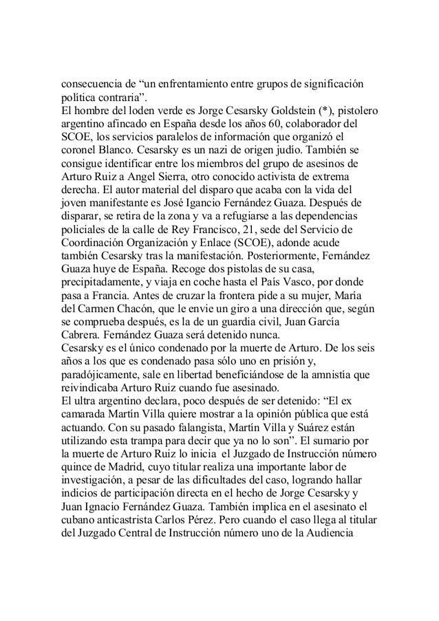- 11. consecuencia de “un enfrentamiento entre grupos de significación política contraria”. El hombre del loden verde es Jorge Cesarsky Goldstein (*), pistolero argentino afincado en España desde los años 60, colaborador del SCOE, los servicios paralelos de información que organizó el coronel Blanco. Cesarsky es un nazi de origen judío. También se consigue identificar entre los miembros del grupo de asesinos de Arturo Ruiz a Angel Sierra, otro conocido activista de extrema derecha. El autor material del disparo que acaba con la vida del joven manifestante es José Igancio Fernández Guaza. Después de disparar, se retira de la zona y va a refugiarse a las dependencias policiales de la calle de Rey Francisco, 21, sede del Servicio de Coordinación Organización y Enlace (SCOE), adonde acude también Cesarsky tras la manifestación. Posteriormente, Fernández Guaza huye de España. Recoge dos pistolas de su casa, precipitadamente, y viaja en coche hasta el País Vasco, por donde pasa a Francia. Antes de cruzar la frontera pide a su mujer, María del Carmen Chacón, que le envie un giro a una dirección que, según se comprueba después, es la de un guardia civil, Juan García Cabrera. Fernández Guaza será detenido nunca. Cesarsky es el único condenado por la muerte de Arturo. De los seis años a los que es condenado pasa sólo uno en prisión y, paradójicamente, sale en libertad beneficiándose de la amnistía que reivindicaba Arturo Ruiz cuando fue asesinado. El ultra argentino declara, poco después de ser detenido: “El ex camarada Martín Villa quiere mostrar a la opinión pública que está actuando. Con su pasado falangista, Martín Villa y Suárez están utilizando esta trampa para decir que ya no lo son”. El sumario por la muerte de Arturo Ruiz lo inicia el Juzgado de Instrucción número quince de Madrid, cuyo titular realiza una importante labor de investigación, a pesar de las dificultades del caso, logrando hallar indicios de participación directa en el hecho de Jorge Cesarsky y Juan Ignacio Fernández Guaza. También implica en el asesinato el cubano anticastrista Carlos Pérez. Pero cuando el caso llega al titular del Juzgado Central de Instrucción número uno de la Audiencia