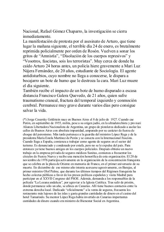 - 12. Nacional, Rafael Gómez Chaparro, la investigación se cierra inmediatamente. La manifestación de protesta por el asesinato de Arturo, que tiene lugar la mañana siguiente, el terrible día 24 de enero, es brutalmente reprimida policialmente por orden de Rosón. Vuelven a sonar los gritos de “Amnistía”, “Disolución de los cuerpos represivos” y “Vosotros, fascistas, sois los terroristas”. Muy cerca de donde ha caído Arturo 24 horas antes, un policía hiere gravemente a Mari Luz Nájera Fernández, de 20 años, estudiante de Sociología. El agente antidisturbios, cuyo nombre no llega a conocerse, le dispara a bocajarro un bote de humo que le destroza la cara. Mari Luz muere el día siguiente. También recibe el impacto de un bote de humo disparado a escasa distancia Francisco Galera Quevedo, de 21 años, quien sufre traumatismo craneal, fractura del temporal izquierdo y conmoción cerebral. Permanece muy grave durante varios días pero consigue salvar la vida. (*) Jorge Cesarsky Goldstein nace en Buenos Aires el 8 de julio de 1927. Cuando cae Perón, en septiembre de 1955, milita, pese a su origen judío, en la ultraderechista y pro nazi Alianza Libertadora Nacionalista de Argentina, un grupo de pistoleros dedicado a asolar las calles de Buenos Aires con absoluta impunidad, amparado por su carácter de fuerza de choque del peronismo. Más tarde pertenece a la guardia del ministro López Rega y de la presidenta María Estela Martínez de Perón y se conecta con la Internacional Fascista. Cuando llega a España, comienza a trabajar como agente de seguros en el sector del turismo. Es denunciado y condenado por estafa, pero no se le expulsa del país. Para entonces ya tiene buenos amigos en los cuerpos policiales. Después obtiene un nuevo trabajo en la empresa privada de seguros médicos Sanitas, comienza a frecuentar los círculos de Fuerza Nueva y recibe una mención honorífica de esta organización. El 20 de noviembre de 1976 participa activamente en la organización de la concentración franquista que se celebra en la plaza de Oriente en memoria de Franco, en el primer aniversario de su muerte. En diciembre de ese mismo año intenta acercarse agresivamente, en Barajas, al primer ministro Olof Palme, que durante los últimos tiempos del Régimen franquista ha hecho colectas públicas a favor de los presos políticos españoles y visita Madrid para participar en el XXVII Congreso del PSOE. Además, demanda a los responsables de la película “La Lozana andaluza”, por agraviar a la Iglesia Católica. Tras salir de prisión, donde permanece sólo un año, se afinca en Canarias. Allí tiene buenos contactos entre la extrema derecha local. Dedicado “oficialmente” a la venta de seguros, frecuenta los restaurante más lujosos de las islas y gasta grandes cantidades de dinero en el casino del hotel Tamarindo. Su mentor López Rega había invertido en Canarias importantes cantidades de dinero cuando era ministro de Bienestar Social en Argentina.