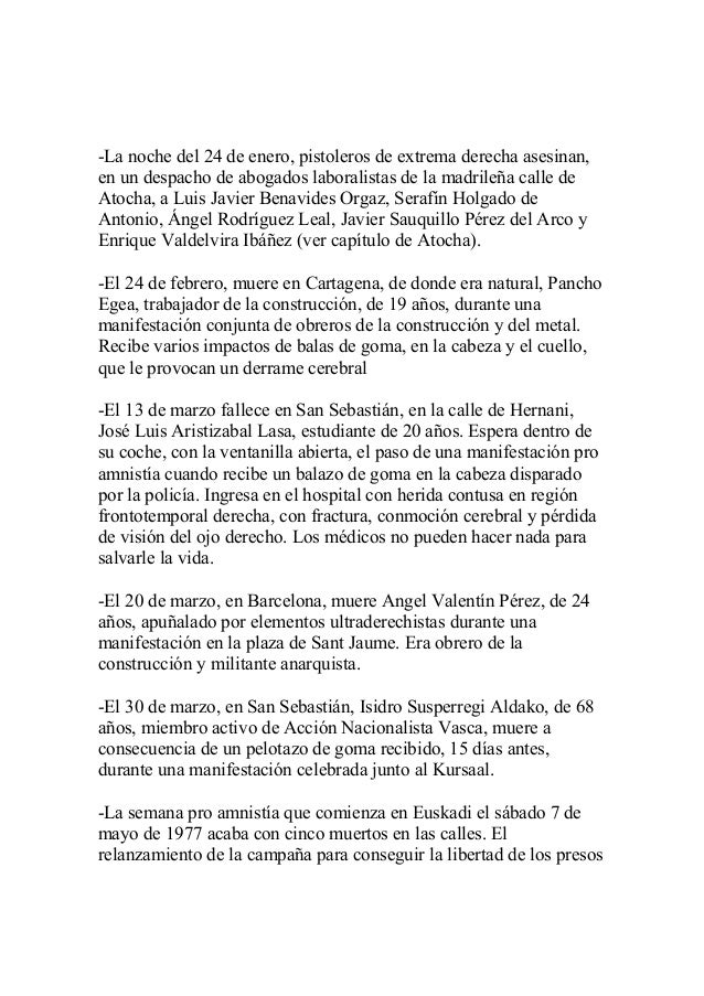 - 13. -La noche del 24 de enero, pistoleros de extrema derecha asesinan, en un despacho de abogados laboralistas de la madrileña calle de Atocha, a Luis Javier Benavides Orgaz, Serafín Holgado de Antonio, Ángel Rodríguez Leal, Javier Sauquillo Pérez del Arco y Enrique Valdelvira Ibáñez (ver capítulo de Atocha). -El 24 de febrero, muere en Cartagena, de donde era natural, Pancho Egea, trabajador de la construcción, de 19 años, durante una manifestación conjunta de obreros de la construcción y del metal. Recibe varios impactos de balas de goma, en la cabeza y el cuello, que le provocan un derrame cerebral -El 13 de marzo fallece en San Sebastián, en la calle de Hernani, José Luis Aristizabal Lasa, estudiante de 20 años. Espera dentro de su coche, con la ventanilla abierta, el paso de una manifestación pro amnistía cuando recibe un balazo de goma en la cabeza disparado por la policía. Ingresa en el hospital con herida contusa en región frontotemporal derecha, con fractura, conmoción cerebral y pérdida de visión del ojo derecho. Los médicos no pueden hacer nada para salvarle la vida. -El 20 de marzo, en Barcelona, muere Angel Valentín Pérez, de 24 años, apuñalado por elementos ultraderechistas durante una manifestación en la plaza de Sant Jaume. Era obrero de la construcción y militante anarquista. -El 30 de marzo, en San Sebastián, Isidro Susperregi Aldako, de 68 años, miembro activo de Acción Nacionalista Vasca, muere a consecuencia de un pelotazo de goma recibido, 15 días antes, durante una manifestación celebrada junto al Kursaal. -La semana pro amnistía que comienza en Euskadi el sábado 7 de mayo de 1977 acaba con cinco muertos en las calles. El relanzamiento de la campaña para conseguir la libertad de los presos