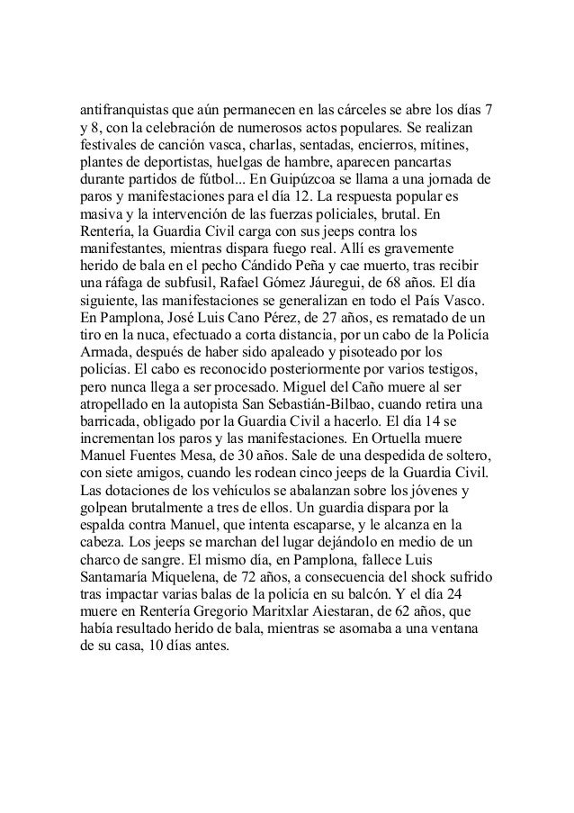 - 14. antifranquistas que aún permanecen en las cárceles se abre los días 7 y 8, con la celebración de numerosos actos populares. Se realizan festivales de canción vasca, charlas, sentadas, encierros, mítines, plantes de deportistas, huelgas de hambre, aparecen pancartas durante partidos de fútbol... En Guipúzcoa se llama a una jornada de paros y manifestaciones para el día 12. La respuesta popular es masiva y la intervención de las fuerzas policiales, brutal. En Rentería, la Guardia Civil carga con sus jeeps contra los manifestantes, mientras dispara fuego real. Allí es gravemente herido de bala en el pecho Cándido Peña y cae muerto, tras recibir una ráfaga de subfusil, Rafael Gómez Jáuregui, de 68 años. El día siguiente, las manifestaciones se generalizan en todo el País Vasco. En Pamplona, José Luis Cano Pérez, de 27 años, es rematado de un tiro en la nuca, efectuado a corta distancia, por un cabo de la Policía Armada, después de haber sido apaleado y pisoteado por los policías. El cabo es reconocido posteriormente por varios testigos, pero nunca llega a ser procesado. Miguel del Caño muere al ser atropellado en la autopista San Sebastián-Bilbao, cuando retira una barricada, obligado por la Guardia Civil a hacerlo. El día 14 se incrementan los paros y las manifestaciones. En Ortuella muere Manuel Fuentes Mesa, de 30 años. Sale de una despedida de soltero, con siete amigos, cuando les rodean cinco jeeps de la Guardia Civil. Las dotaciones de los vehículos se abalanzan sobre los jóvenes y golpean brutalmente a tres de ellos. Un guardia dispara por la espalda contra Manuel, que intenta escaparse, y le alcanza en la cabeza. Los jeeps se marchan del lugar dejándolo en medio de un charco de sangre. El mismo día, en Pamplona, fallece Luis Santamaría Miquelena, de 72 años, a consecuencia del shock sufrido tras impactar varias balas de la policía en su balcón. Y el día 24 muere en Rentería Gregorio Maritxlar Aiestaran, de 62 años, que había resultado herido de bala, mientras se asomaba a una ventana de su casa, 10 días antes.