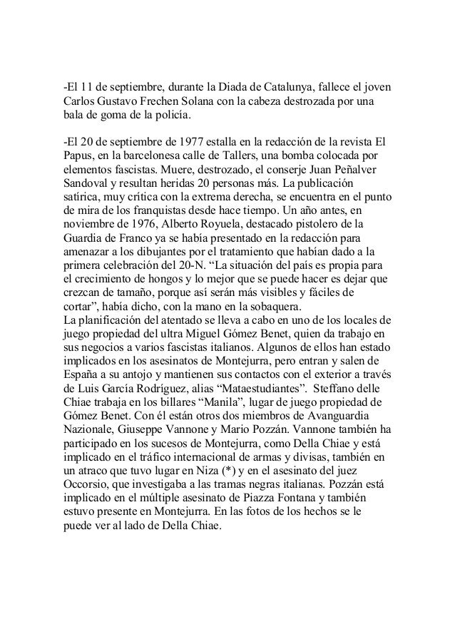 - 15. -El 11 de septiembre, durante la Diada de Catalunya, fallece el joven Carlos Gustavo Frechen Solana con la cabeza destrozada por una bala de goma de la policía. -El 20 de septiembre de 1977 estalla en la redacción de la revista El Papus, en la barcelonesa calle de Tallers, una bomba colocada por elementos fascistas. Muere, destrozado, el conserje Juan Peñalver Sandoval y resultan heridas 20 personas más. La publicación satírica, muy crítica con la extrema derecha, se encuentra en el punto de mira de los franquistas desde hace tiempo. Un año antes, en noviembre de 1976, Alberto Royuela, destacado pistolero de la Guardia de Franco ya se había presentado en la redacción para amenazar a los dibujantes por el tratamiento que habían dado a la primera celebración del 20-N. “La situación del país es propia para el crecimiento de hongos y lo mejor que se puede hacer es dejar que crezcan de tamaño, porque así serán más visibles y fáciles de cortar”, había dicho, con la mano en la sobaquera. La planificación del atentado se lleva a cabo en uno de los locales de juego propiedad del ultra Miguel Gómez Benet, quien da trabajo en sus negocios a varios fascistas italianos. Algunos de ellos han estado implicados en los asesinatos de Montejurra, pero entran y salen de España a su antojo y mantienen sus contactos con el exterior a través de Luis García Rodríguez, alias “Mataestudiantes”. Steffano delle Chiae trabaja en los billares “Manila”, lugar de juego propiedad de Gómez Benet. Con él están otros dos miembros de Avanguardia Nazionale, Giuseppe Vannone y Mario Pozzán. Vannone también ha participado en los sucesos de Montejurra, como Della Chiae y está implicado en el tráfico internacional de armas y divisas, también en un atraco que tuvo lugar en Niza (*) y en el asesinato del juez Occorsio, que investigaba a las tramas negras italianas. Pozzán está implicado en el múltiple asesinato de Piazza Fontana y también estuvo presente en Montejurra. En las fotos de los hechos se le puede ver al lado de Della Chiae.