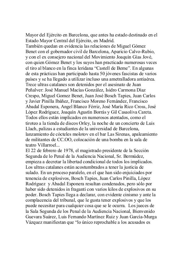 - 17. Mayor del Ejército en Barcelona, que antes ha estado destinado en el Estado Mayor Central del Ejército, en Madrid. También quedan en evidencia las relaciones de Miguel Gómez Benet con el gobernador civil de Barcelona, Aparicio Calvo-Rubio, y con el ex consejero nacional del Movimiento Joaquín Gías Jové, con quien Gómez Benet y los suyos han practicado numerosas veces el tiro al blanco en la finca leridana “Castell de Beme”. En algunas de esta prácticas han participado hasta 50 jóvenes fascistas de varios países y se ha llegado a utilizar incluso una ametralladora antiaérea. Trece ultras catalanes son detenidos por el asesinato de Juan Peñalver: José Manuel Macías González, Isidro Carmona Díaz Crespo, Miguel Gomez Benet, Juan José Bosch Tapies, Juan Carlos y Javier Pinilla Ibáñez, Francisco Moreno Fernández, Francisco Abadal Esponera, Angel Blanco Férriz, José María Rico Cross, José López Rodríguez, Joaquín Agustín Borrás y Gil Casaoliva Careta. Todos ellos están implicados en numerosos atentados, como el tiroteo a la tienda de discos Orley, la noche de un concierto de Luis Llach, palizas a estudiantes de la universidad de Barcelona, lanzamiento de cócteles molotov en el bar Las Sirenas, apaleamiento de militantes de CC.OO, colocación de una bomba en la sala de teatro Villarroel... El 22 de febrero de 1978, el magistrado presidente de la Sección Segunda de lo Penal de la Audiencia Nacional, Sr. Bermúdez, empieza a decretar la libertad condicional de todos los implicados. Los ultras catalanes están acostumbrados a tener la justicia de sulado. En un proceso paralelo, en el que han sido enjuiciados por tenencia de explosivos, Bosch Tapies, Juan Carlos Pinilla, López Rodríguez y Abadal Esponera resultan condenados, pero sólo por haber sido detenidos in fraganti con varios kilos de explosivos en su poder. Bosch Tapies llega a declarar, con evidente cinismo y ante la complacencia del tribunal, que le gusta tener explosivos y que los puede necesitar para cualquier cosa que se le ocurra. Los jueces de la Sala Segunda de los Penal de la Audiencia Nacional, Bienvenido Guevara Suárez, Luis Fernando Martínez Ruiz y Juan García-Murga Vázquez manifiestan que “lo único reprochable a los acusados es