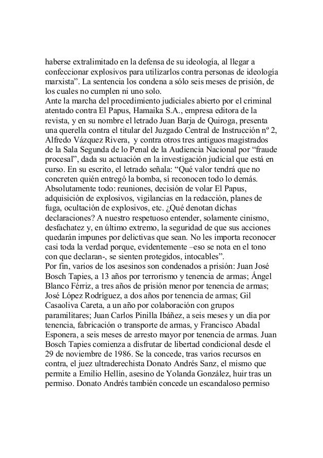 - 18. haberse extralimitado en la defensa de su ideología, al llegar a confeccionar explosivos para utilizarlos contra personas de ideología marxista”. La sentencia los condena a sólo seis meses de prisión, de los cuales no cumplen ni uno solo. Ante la marcha del procedimiento judiciales abierto por el criminal atentado contra El Papus, Hamaika S.A., empresa editora de la revista, y en su nombre el letrado Juan Barja de Quiroga, presenta una querella contra el titular del Juzgado Central de Instrucción nº 2, Alfredo Vázquez Rivera, y contra otros tres antiguos magistrados de la Sala Segunda de lo Penal de la Audiencia Nacional por “fraude procesal”, dada su actuación en la investigación judicial que está en curso. En su escrito, el letrado señala: “Qué valor tendrá que no concreten quién entregó la bomba, sí reconocen todo lo demás. Absolutamente todo: reuniones, decisión de volar El Papus, adquisición de explosivos, vigilancias en la redacción, planes de fuga, ocultación de explosivos, etc. ¿Qué denotan dichas declaraciones? A nuestro respetuoso entender, solamente cinismo, desfachatez y, en último extremo, la seguridad de que sus acciones quedarán impunes por delictivas que sean. No les importa reconocer casi toda la verdad porque, evidentemente –eso se nota en el tono con que declaran-, se sienten protegidos, intocables”. Por fin, varios de los asesinos son condenados a prisión: Juan José Bosch Tapies, a 13 años por terrorismo y tenencia de armas; Ángel Blanco Férriz, a tres años de prisión menor por tenencia de armas; José López Rodríguez, a dos años por tenencia de armas; Gil Casaoliva Careta, a un año por colaboración con grupos paramilitares; Juan Carlos Pinilla Ibáñez, a seis meses y un día por tenencia, fabricación o transporte de armas, y Francisco Abadal Esponera, a seis meses de arresto mayor por tenencia de armas. Juan Bosch Tapies comienza a disfrutar de libertad condicional desde el 29 de noviembre de 1986. Se la concede, tras varios recursos en contra, el juez ultraderechista Donato Andrés Sanz, el mismo que permite a Emilio Hellín, asesino de Yolanda González, huir tras un permiso. Donato Andrés también concede un escandaloso permiso