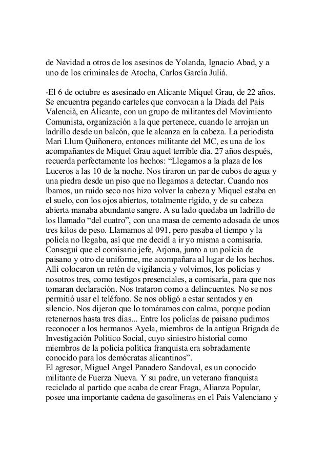 - 19. de Navidad a otros de los asesinos de Yolanda, Ignacio Abad, y a uno de los criminales de Atocha, Carlos García Juliá. -El 6 de octubre es asesinado en Alicante Miquel Grau, de 22 años. Se encuentra pegando carteles que convocan a la Diada del País Valencià, en Alicante, con un grupo de militantes del Movimiento Comunista, organización a la que pertenece, cuando le arrojan un ladrillo desde un balcón, que le alcanza en la cabeza. La periodista Mari Llum Quiñonero, entonces militante del MC, es una de los acompañantes de Miquel Grau aquel terrible día. 27 años después, recuerda perfectamente los hechos: “Llegamos a la plaza de los Luceros a las 10 de la noche. Nos tiraron un par de cubos de agua y una piedra desde un piso que no llegamos a detectar. Cuando nos íbamos, un ruido seco nos hizo volver la cabeza y Miquel estaba en el suelo, con los ojos abiertos, totalmente rígido, y de su cabeza abierta manaba abundante sangre. A su lado quedaba un ladrillo de los llamado “del cuatro”, con una masa de cemento adosada de unos tres kilos de peso. Llamamos al 091, pero pasaba el tiempo y la policía no llegaba, así que me decidí a ir yo misma a comisaría. Conseguí que el comisario jefe, Arjona, junto a un policía de paisano y otro de uniforme, me acompañara al lugar de los hechos. Allí colocaron un retén de vigilancia y volvimos, los policías y nosotros tres, como testigos presenciales, a comisaría, para que nos tomaran declaración. Nos trataron como a delincuentes. No se nos permitió usar el teléfono. Se nos obligó a estar sentados y en silencio. Nos dijeron que lo tomáramos con calma, porque podían retenernos hasta tres días... Entre los policías de paisano pudimos reconocer a los hermanos Ayela, miembros de la antigua Brigada de Investigación Político Social, cuyo siniestro historial como miembros de la policía política franquista era sobradamente conocido para los demócratas alicantinos”. El agresor, Miguel Angel Panadero Sandoval, es un conocido militante de Fuerza Nueva. Y su padre, un veterano franquista reciclado al partido que acaba de crear Fraga, Alianza Popular, posee una importante cadena de gasolineras en el País Valenciano y