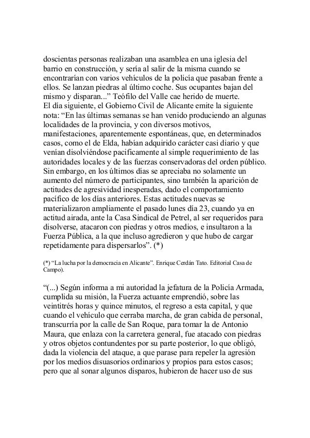 - 2. doscientas personas realizaban una asamblea en una iglesia del barrio en construcción, y sería al salir de la misma cuando se encontrarían con varios vehículos de la policía que pasaban frente a ellos. Se lanzan piedras al último coche. Sus ocupantes bajan del mismo y disparan...” Teófilo del Valle cae herido de muerte. El día siguiente, el Gobierno Civil de Alicante emite la siguiente nota: “En las últimas semanas se han venido produciendo an algunas localidades de la provincia, y con diversos motivos, manifestaciones, aparentemente espontáneas, que, en determinados casos, como el de Elda, habían adquirido carácter casi diario y que venían disolviéndose pacificamente al simple requerimiento de las autoridades locales y de las fuerzas conservadoras del orden público. Sin embargo, en los últimos días se apreciaba no solamente un aumento del número de participantes, sino también la aparición de actitudes de agresividad inesperadas, dado el comportamiento pacífico de los días anteriores. Estas actitudes nuevas se materializaron ampliamente el pasado lunes día 23, cuando ya en actitud airada, ante la Casa Sindical de Petrel, al ser requeridos para disolverse, atacaron con piedras y otros medios, e insultaron a la Fuerza Pública, a la que incluso agredieron y que hubo de cargar repetidamente para dispersarlos”. (*) (*) “La lucha por la democracia en Alicante”. Enrique Cerdán Tato. Editorial Casa de Campo). “(...) Según informa a mi autoridad la jefatura de la Policía Armada, cumplida su misión, la Fuerza actuante emprendió, sobre las veintitrés horas y quince minutos, el regreso a esta capital, y que cuando el vehículo que cerraba marcha, de gran cabida de personal, transcurría por la calle de San Roque, para tomar la de Antonio Maura, que enlaza con la carretera general, fue atacado con piedras y otros objetos contundentes por su parte posterior, lo que obligó, dada la violencia del ataque, a que parase para repeler la agresión por los medios disuasorios ordinarios y propios para estos casos; pero que al sonar algunos disparos, hubieron de hacer uso de sus
