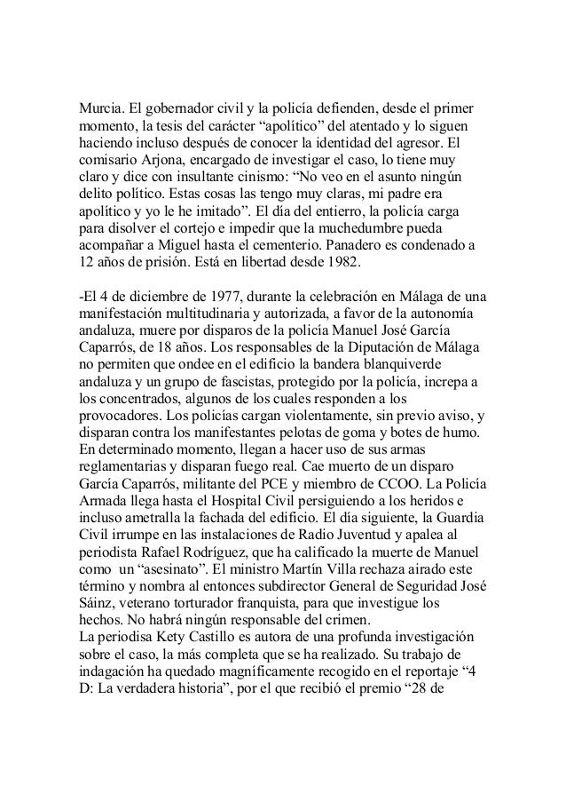 - 20. Murcia. El gobernador civil y la policía defienden, desde el primer momento, la tesis del carácter “apolítico” del atentado y lo siguen haciendo incluso después de conocer la identidad del agresor. El comisario Arjona, encargado de investigar el caso, lo tiene muy claro y dice con insultante cinismo: “No veo en el asunto ningún delito político. Estas cosas las tengo muy claras, mi padre era apolítico y yo le he imitado”. El día del entierro, la policía carga para disolver el cortejo e impedir que la muchedumbre pueda acompañar a Miguel hasta el cementerio. Panadero es condenado a 12 años de prisión. Está en libertad desde 1982. -El 4 de diciembre de 1977, durante la celebración en Málaga de una manifestación multitudinaria y autorizada, a favor de la autonomía andaluza, muere por disparos de la policía Manuel José García Caparrós, de 18 años. Los responsables de la Diputación de Málaga no permiten que ondee en el edificio la bandera blanquiverde andaluza y un grupo de fascistas, protegido por la policía, increpa a los concentrados, algunos de los cuales responden a los provocadores. Los policías cargan violentamente, sin previo aviso, y disparan contra los manifestantes pelotas de goma y botes de humo. En determinado momento, llegan a hacer uso de sus armas reglamentarias y disparan fuego real. Cae muerto de un disparo García Caparrós, militante del PCE y miembro de CCOO. La Policía Armada llega hasta el Hospital Civil persiguiendo a los heridos e incluso ametralla la fachada del edificio. El día siguiente, la Guardia Civil irrumpe en las instalaciones de Radio Juventud y apalea al periodista Rafael Rodríguez, que ha calificado la muerte de Manuel como un “asesinato”. El ministro Martín Villa rechaza airado este término y nombra al entonces subdirector General de Seguridad José Sáinz, veterano torturador franquista, para que investigue los hechos. No habrá ningún responsable del crimen. La periodisa Kety Castillo es autora de una profunda investigación sobre el caso, la más completa que se ha realizado. Su trabajo de indagación ha quedado magníficamente recogido en el reportaje “4 D: La verdadera historia”, por el que recibió el premio “28 de
