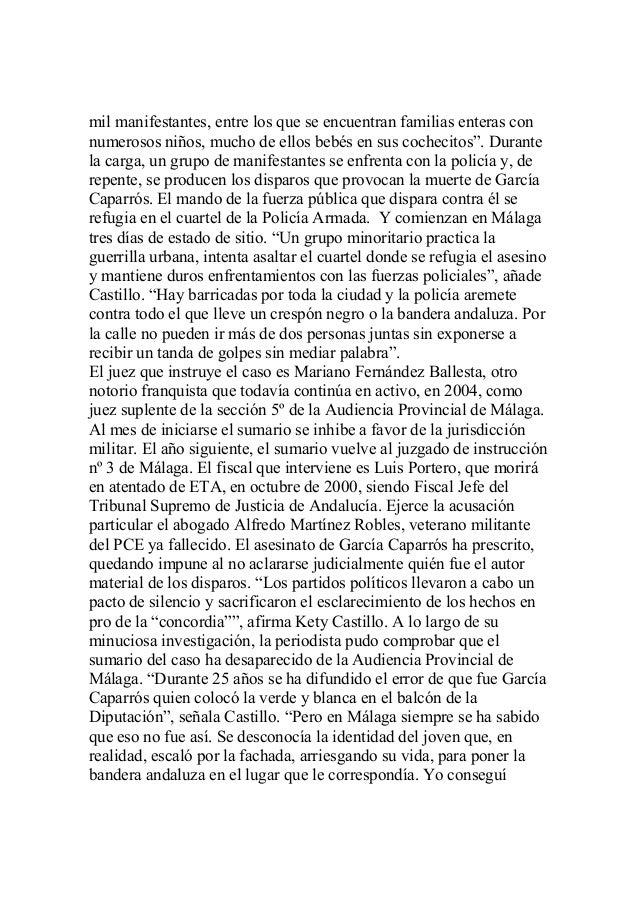 - 22. mil manifestantes, entre los que se encuentran familias enteras con numerosos niños, mucho de ellos bebés en sus cochecitos”. Durante la carga, un grupo de manifestantes se enfrenta con la policía y, de repente, se producen los disparos que provocan la muerte de García Caparrós. El mando de la fuerza pública que dispara contra él se refugia en el cuartel de la Policía Armada. Y comienzan en Málaga tres días de estado de sitio. “Un grupo minoritario practica la guerrilla urbana, intenta asaltar el cuartel donde se refugia el asesino y mantiene duros enfrentamientos con las fuerzas policiales”, añade Castillo. “Hay barricadas por toda la ciudad y la policía aremete contra todo el que lleve un crespón negro o la bandera andaluza. Por la calle no pueden ir más de dos personas juntas sin exponerse a recibir un tanda de golpes sin mediar palabra”. El juez que instruye el caso es Mariano Fernández Ballesta, otro notorio franquista que todavía continúa en activo, en 2004, como juez suplente de la sección 5º de la Audiencia Provincial de Málaga. Al mes de iniciarse el sumario se inhibe a favor de la jurisdicción militar. El año siguiente, el sumario vuelve al juzgado de instrucción nº 3 de Málaga. El fiscal que interviene es Luis Portero, que morirá en atentado de ETA, en octubre de 2000, siendo Fiscal Jefe del Tribunal Supremo de Justicia de Andalucía. Ejerce la acusación particular el abogado Alfredo Martínez Robles, veterano militante del PCE ya fallecido. El asesinato de García Caparrós ha prescrito, quedando impune al no aclararse judicialmente quién fue el autor material de los disparos. “Los partidos políticos llevaron a cabo un pacto de silencio y sacrificaron el esclarecimiento de los hechos en pro de la “concordia””, afirma Kety Castillo. A lo largo de su minuciosa investigación, la periodista pudo comprobar que el sumario del caso ha desaparecido de la Audiencia Provincial de Málaga. “Durante 25 años se ha difundido el error de que fue García Caparrós quien colocó la verde y blanca en el balcón de la Diputación”, señala Castillo. “Pero en Málaga siempre se ha sabido que eso no fue así. Se desconocía la identidad del joven que, en realidad, escaló por la fachada, arriesgando su vida, para poner la bandera andaluza en el lugar que le correspondía. Yo conseguí