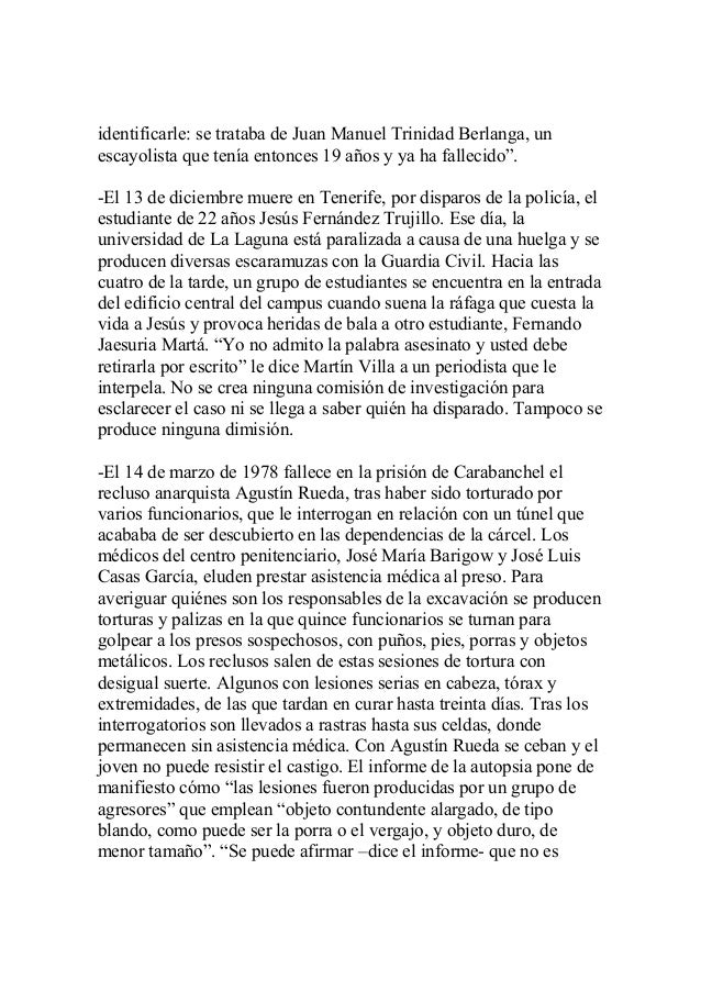 - 23. identificarle: se trataba de Juan Manuel Trinidad Berlanga, un escayolista que tenía entonces 19 años y ya ha fallecido”. -El 13 de diciembre muere en Tenerife, por disparos de la policía, el estudiante de 22 años Jesús Fernández Trujillo. Ese día, la universidad de La Laguna está paralizada a causa de una huelga y se producen diversas escaramuzas con la Guardia Civil. Hacia las cuatro de la tarde, un grupo de estudiantes se encuentra en la entrada del edificio central del campus cuando suena la ráfaga que cuesta la vida a Jesús y provoca heridas de bala a otro estudiante, Fernando Jaesuria Martá. “Yo no admito la palabra asesinato y usted debe retirarla por escrito” le dice Martín Villa a un periodista que le interpela. No se crea ninguna comisión de investigación para esclarecer el caso ni se llega a saber quién ha disparado. Tampoco se produce ninguna dimisión. -El 14 de marzo de 1978 fallece en la prisión de Carabanchel el recluso anarquista Agustín Rueda, tras haber sido torturado por varios funcionarios, que le interrogan en relación con un túnel que acababa de ser descubierto en las dependencias de la cárcel. Los médicos del centro penitenciario, José María Barigow y José Luis Casas García, eluden prestar asistencia médica al preso. Para averiguar quiénes son los responsables de la excavación se producen torturas y palizas en la que quince funcionarios se turnan para golpear a los presos sospechosos, con puños, pies, porras y objetos metálicos. Los reclusos salen de estas sesiones de tortura con desigual suerte. Algunos con lesiones serias en cabeza, tórax y extremidades, de las que tardan en curar hasta treinta días. Tras los interrogatorios son llevados a rastras hasta sus celdas, donde permanecen sin asistencia médica. Con Agustín Rueda se ceban y el joven no puede resistir el castigo. El informe de la autopsia pone de manifiesto cómo “las lesiones fueron producidas por un grupo de agresores” que emplean “objeto contundente alargado, de tipo blando, como puede ser la porra o el vergajo, y objeto duro, de menor tamaño”. “Se puede afirmar –dice el informe- que no es