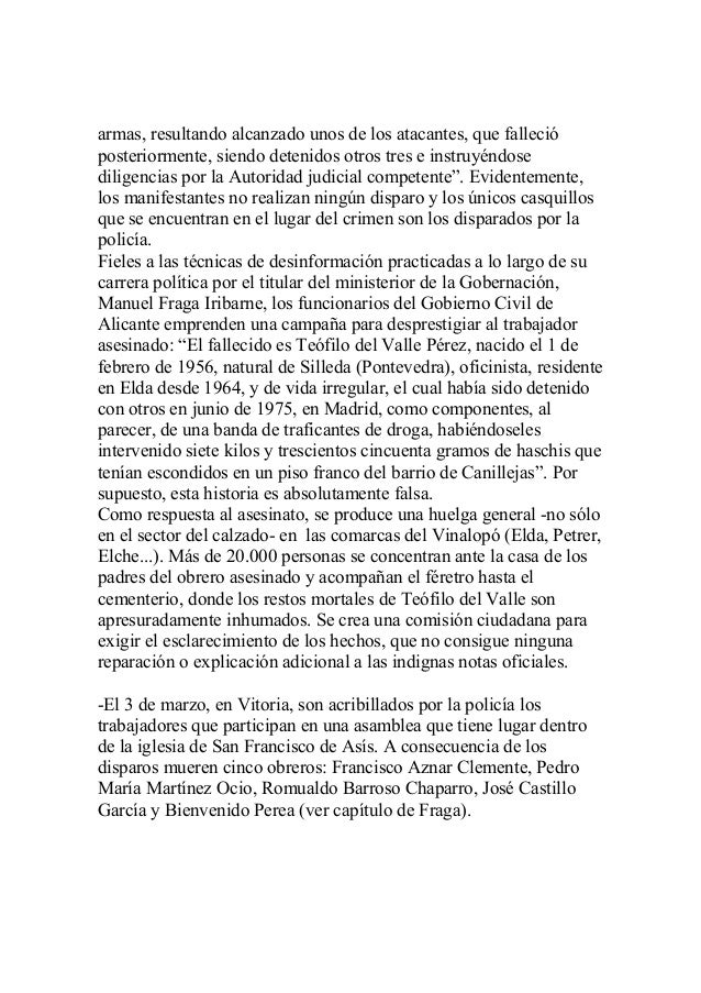 - 3. armas, resultando alcanzado unos de los atacantes, que falleció posteriormente, siendo detenidos otros tres e instruyéndose diligencias por la Autoridad judicial competente”. Evidentemente, los manifestantes no realizan ningún disparo y los únicos casquillos que se encuentran en el lugar del crimen son los disparados por la policía. Fieles a las técnicas de desinformación practicadas a lo largo de su carrera política por el titular del ministerior de la Gobernación, Manuel Fraga Iribarne, los funcionarios del Gobierno Civil de Alicante emprenden una campaña para desprestigiar al trabajador asesinado: “El fallecido es Teófilo del Valle Pérez, nacido el 1 de febrero de 1956, natural de Silleda (Pontevedra), oficinista, residente en Elda desde 1964, y de vida irregular, el cual había sido detenido con otros en junio de 1975, en Madrid, como componentes, al parecer, de una banda de traficantes de droga, habiéndoseles intervenido siete kilos y trescientos cincuenta gramos de haschis que tenían escondidos en un piso franco del barrio de Canillejas”. Por supuesto, esta historia es absolutamente falsa. Como respuesta al asesinato, se produce una huelga general -no sólo en el sector del calzado- en las comarcas del Vinalopó (Elda, Petrer, Elche...). Más de 20.000 personas se concentran ante la casa de los padres del obrero asesinado y acompañan el féretro hasta el cementerio, donde los restos mortales de Teófilo del Valle son apresuradamente inhumados. Se crea una comisión ciudadana para exigir el esclarecimiento de los hechos, que no consigue ninguna reparación o explicación adicional a las indignas notas oficiales. -El 3 de marzo, en Vitoria, son acribillados por la policía los trabajadores que participan en una asamblea que tiene lugar dentro de la iglesia de San Francisco de Asís. A consecuencia de los disparos mueren cinco obreros: Francisco Aznar Clemente, Pedro María Martínez Ocio, Romualdo Barroso Chaparro, José Castillo García y Bienvenido Perea (ver capítulo de Fraga).