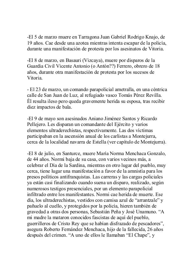 - 4. -El 5 de marzo muere en Tarragona Juan Gabriel Rodrigo Knajo, de 19 años. Cae desde una azotea mientras intenta escapar de la policía, durante una manifestación de protesta por los asesinatos de Vitoria. -El 8 de marzo, en Basauri (Vizcaya), muere por disparos de la Guardia Civil Vicente Antonio (o Antón??) Ferrero, obrero de 18 años, durante otra manifestación de protesta por los sucesos de Vitoria. - El 23 de marzo, un comando parapolicial ametralla, en una céntrica calle de San Juan de Luz, al refugiado vasco Tomás Pérez Revilla. Él resulta ileso pero queda gravemente herida su esposa, tras recibir diez impactos de bala. -El 9 de mayo son asesinados Aniano Jiménez Santos y Ricardo Pellejero. Les disparan un comandante del Ejército y varios elementos ultraderechistas, respectivamente. Las dos víctimas participaban en la ascensión anual de los carlistas a Montejurra, cerca de la localidad navarra de Estella (ver capítulo de Montejurra). -El 8 de julio, en Santurce, muere María Norma Menchaca Gonzalo, de 44 años. Normi baja de su casa, con varios vecinos más, a celebrar el Día de la Sardina, mientras en otro lugar del pueblo, muy cerca, tiene lugar una manifestación a favor de la amnistía para los presos políticos antifranquistas. Las carreras y las cargas policiales ya están casi finalizando cuando suena un disparo, realizado, según numerosos testigos presenciales, por un elemento parapolicial infiltrado entre los manifestantes. Normi cae herida de muerte. Ese día, los ultraderechistas, vestidos con camisa azul de “arrantzale” y pañuelo al cuello, y protegidos por la policía, hieren también de gravedad a otras dos personas, Sebastián Peña y José Unamuno. “A mi madre la mataron conocidos fascistas de aquí del pueblo, guerrilleros de Cristo Rey que se habían disfrazado de pescadores”, asegura Roberto Fernández Menchaca, hijo de la fallecida, 26 años después del crimen. “A uno de ellos le llamaban “El Chape”, y