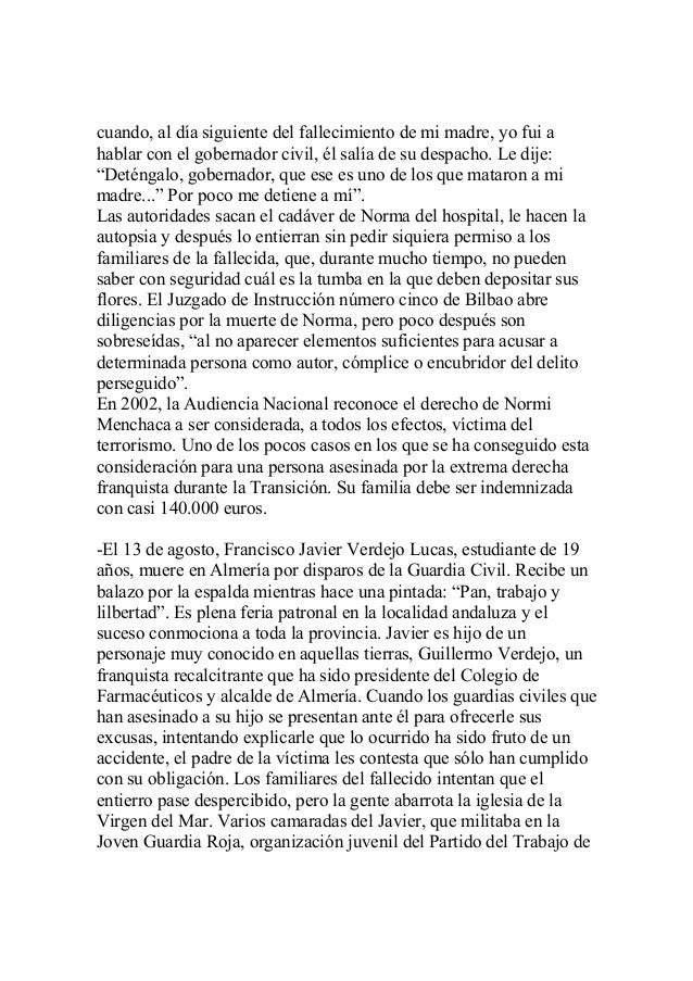 - 5. cuando, al día siguiente del fallecimiento de mi madre, yo fui a hablar con el gobernador civil, él salía de su despacho. Le dije: “Deténgalo, gobernador, que ese es uno de los que mataron a mi madre...” Por poco me detiene a mí”. Las autoridades sacan el cadáver de Norma del hospital, le hacen la autopsia y después lo entierran sin pedir siquiera permiso a los familiares de la fallecida, que, durante mucho tiempo, no pueden saber con seguridad cuál es la tumba en la que deben depositar sus flores. El Juzgado de Instrucción número cinco de Bilbao abre diligencias por la muerte de Norma, pero poco después son sobreseídas, “al no aparecer elementos suficientes para acusar a determinada persona como autor, cómplice o encubridor del delito perseguido”. En 2002, la Audiencia Nacional reconoce el derecho de Normi Menchaca a ser considerada, a todos los efectos, víctima del terrorismo. Uno de los pocos casos en los que se ha conseguido esta consideración para una persona asesinada por la extrema derecha franquista durante la Transición. Su familia debe ser indemnizada con casi 140.000 euros. -El 13 de agosto, Francisco Javier Verdejo Lucas, estudiante de 19 años, muere en Almería por disparos de la Guardia Civil. Recibe un balazo por la espalda mientras hace una pintada: “Pan, trabajo y lilbertad”. Es plena feria patronal en la localidad andaluza y el suceso conmociona a toda la provincia. Javier es hijo de un personaje muy conocido en aquellas tierras, Guillermo Verdejo, un franquista recalcitrante que ha sido presidente del Colegio de Farmacéuticos y alcalde de Almería. Cuando los guardias civiles que han asesinado a su hijo se presentan ante él para ofrecerle sus excusas, intentando explicarle que lo ocurrido ha sido fruto de un accidente, el padre de la víctima les contesta que sólo han cumplido con su obligación. Los familiares del fallecido intentan que el entierro pase despercibido, pero la gente abarrota la iglesia de la Virgen del Mar. Varios camaradas del Javier, que militaba en la Joven Guardia Roja, organización juvenil del Partido del Trabajo de