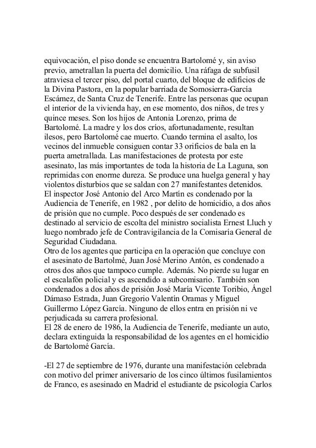 - 7. equivocación, el piso donde se encuentra Bartolomé y, sin aviso previo, ametrallan la puerta del domicilio. Una ráfaga de subfusil atraviesa el tercer piso, del portal cuarto, del bloque de edificios de la Divina Pastora, en la popular barriada de Somosierra-García Escámez, de Santa Cruz de Tenerife. Entre las personas que ocupan el interior de la vivienda hay, en ese momento, dos niños, de tres y quince meses. Son los hijos de Antonia Lorenzo, prima de Bartolomé. La madre y los dos críos, afortunadamente, resultan ilesos, pero Bartolomé cae muerto. Cuando termina el asalto, los vecinos del inmueble consiguen contar 33 orificios de bala en la puerta ametrallada. Las manifestaciones de protesta por este asesinato, las más importantes de toda la historia de La Laguna, son reprimidas con enorme dureza. Se produce una huelga general y hay violentos disturbios que se saldan con 27 manifestantes detenidos. El inspector José Antonio del Arco Martín es condenado por la Audiencia de Tenerife, en 1982 , por delito de homicidio, a dos años de prisión que no cumple. Poco después de ser condenado es destinado al servicio de escolta del ministro socialista Ernest Lluch y luego nombrado jefe de Contravigilancia de la Comisaría General de Seguridad Ciudadana. Otro de los agentes que participa en la operación que concluye con el asesinato de Bartolmé, Juan José Merino Antón, es condenado a otros dos años que tampoco cumple. Además. No pierde su lugar en el escalafón policial y es ascendido a subcomisario. También son condenados a dos años de prisión José María Vicente Toribio, Ángel Dámaso Estrada, Juan Gregorio Valentín Oramas y Miguel Guillermo López García. Ninguno de ellos entra en prisión ni ve perjudicada su carrera profesional. El 28 de enero de 1986, la Audiencia de Tenerife, mediante un auto, declara extinguida la responsabilidad de los agentes en el homicidio de Bartolomé García. -El 27 de septiembre de 1976, durante una manifestación celebrada con motivo del primer aniversario de los cinco últimos fusilamientos de Franco, es asesinado en Madrid el estudiante de psicología Carlos