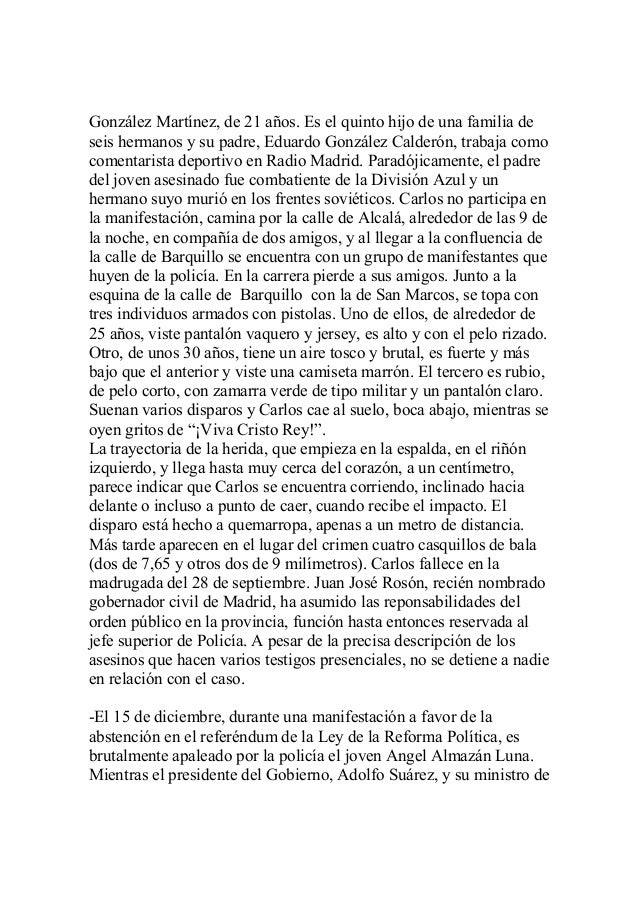 - 8. González Martínez, de 21 años. Es el quinto hijo de una familia de seis hermanos y su padre, Eduardo González Calderón, trabaja como comentarista deportivo en Radio Madrid. Paradójicamente, el padre del joven asesinado fue combatiente de la División Azul y un hermano suyo murió en los frentes soviéticos. Carlos no participa en la manifestación, camina por la calle de Alcalá, alrededor de las 9 de la noche, en compañía de dos amigos, y al llegar a la confluencia de la calle de Barquillo se encuentra con un grupo de manifestantes que huyen de la policía. En la carrera pierde a sus amigos. Junto a la esquina de la calle de Barquillo con la de San Marcos, se topa con tres individuos armados con pistolas. Uno de ellos, de alrededor de 25 años, viste pantalón vaquero y jersey, es alto y con el pelo rizado. Otro, de unos 30 años, tiene un aire tosco y brutal, es fuerte y más bajo que el anterior y viste una camiseta marrón. El tercero es rubio, de pelo corto, con zamarra verde de tipo militar y un pantalón claro. Suenan varios disparos y Carlos cae al suelo, boca abajo, mientras se oyen gritos de “¡Viva Cristo Rey!”. La trayectoria de la herida, que empieza en la espalda, en el riñón izquierdo, y llega hasta muy cerca del corazón, a un centímetro, parece indicar que Carlos se encuentra corriendo, inclinado hacia delante o incluso a punto de caer, cuando recibe el impacto. El disparo está hecho a quemarropa, apenas a un metro de distancia. Más tarde aparecen en el lugar del crimen cuatro casquillos de bala (dos de 7,65 y otros dos de 9 milímetros). Carlos fallece en la madrugada del 28 de septiembre. Juan José Rosón, recién nombrado gobernador civil de Madrid, ha asumido las reponsabilidades del orden público en la provincia, función hasta entonces reservada al jefe superior de Policía. A pesar de la precisa descripción de los asesinos que hacen varios testigos presenciales, no se detiene a nadie en relación con el caso. -El 15 de diciembre, durante una manifestación a favor de la abstención en el referéndum de la Ley de la Reforma Política, es brutalmente apaleado por la policía el joven Angel Almazán Luna. Mientras el presidente del Gobierno, Adolfo Suárez, y su ministro de