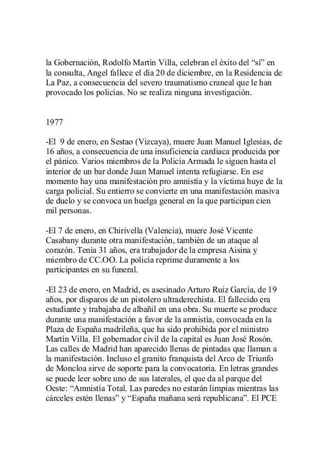 - 9. la Gobernación, Rodolfo Martín Villa, celebran el éxito del “sí” en la consulta, Angel fallece el día 20 de diciembre, en la Residencia de La Paz, a consecuencia del severo traumatismo craneal que le han provocado los policías. No se realiza ninguna investigación. 1977 -El 9 de enero, en Sestao (Vizcaya), muere Juan Manuel Iglesias, de 16 años, a consecuencia de una insuficiencia cardiaca producida por el pánico. Varios miembros de la Policía Armada le siguen hasta el interior de un bar donde Juan Manuel intenta refugiarse. En ese momento hay una manifestación pro amnistía y la víctima huye de la carga policial. Su entierro se convierte en una manifestación masiva de duelo y se convoca un huelga general en la que participan cien mil personas. -El 7 de enero, en Chirivella (Valencia), muere José Vicente Casabany durante otra manifestación, también de un ataque al corazón. Tenía 31 años, era trabajador de la empresa Aisina y miembro de CC.OO. La policía reprime duramente a los participantes en su funeral. -El 23 de enero, en Madrid, es asesinado Arturo Ruiz García, de 19 años, por disparos de un pistolero ultraderechista. El fallecido era estudiante y trabajaba de albañil en una obra. Su muerte se produce durante una manifestación a favor de la amnistía, convocada en la Plaza de España madrileña, que ha sido prohibida por el ministro Martín Villa. El gobernador civil de la capital es Juan José Rosón. Las calles de Madrid han aparecido llenas de pintadas que llaman a la manifestación. Incluso el granito franquista del Arco de Triunfo de Moncloa sirve de soporte para la convocatoria. En letras grandes se puede leer sobre uno de sus laterales, el que da al parque del Oeste: “Amnistía Total. Las paredes no estarán limpias mientras las cárceles estén llenas” y “España mañana será republicana”. El PCE